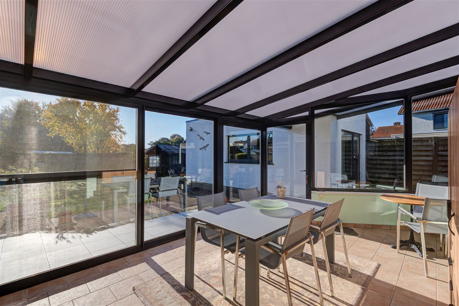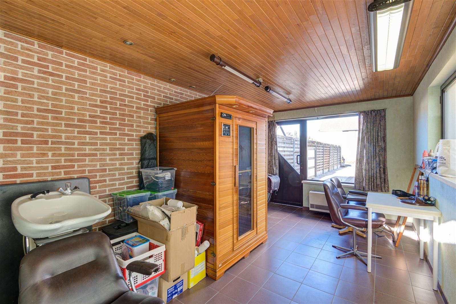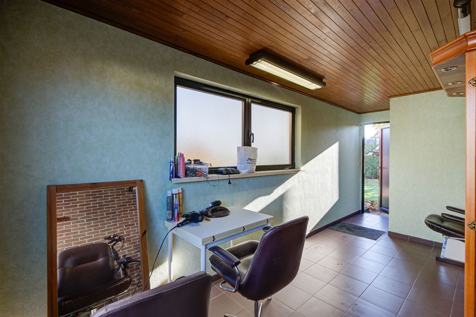 Verder beschikt de woning over een inpandige garage, tuinberging en een bijgebouw van ca. 15 m², momenteel ingericht als kapsalon maar perfect bruikbaar als bureau, atelier of praktijkruimte. Twee opritten zorgen voor voldoende parkeergelegenheid. De volledig omheinde tuin biedt rust en privacy.
