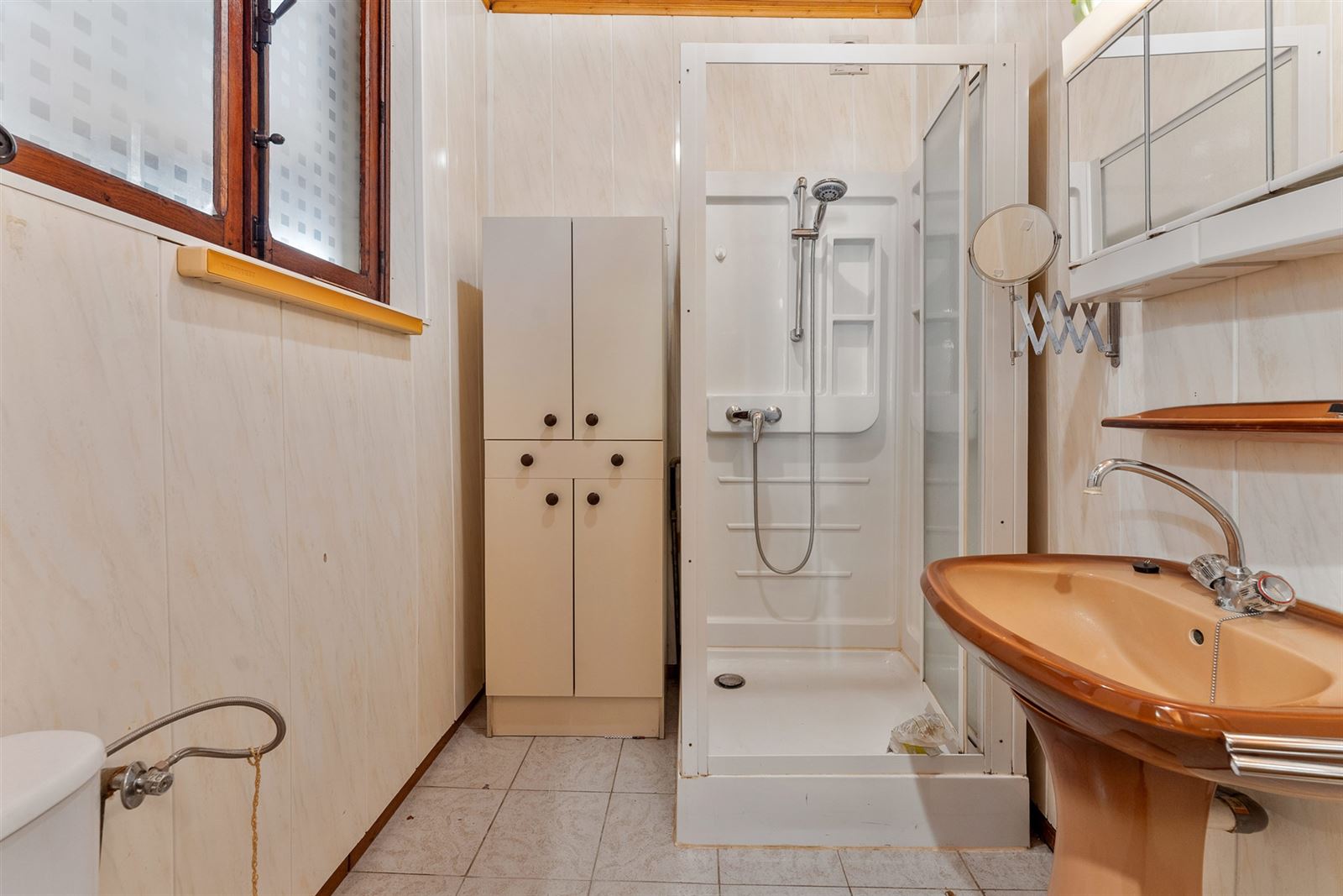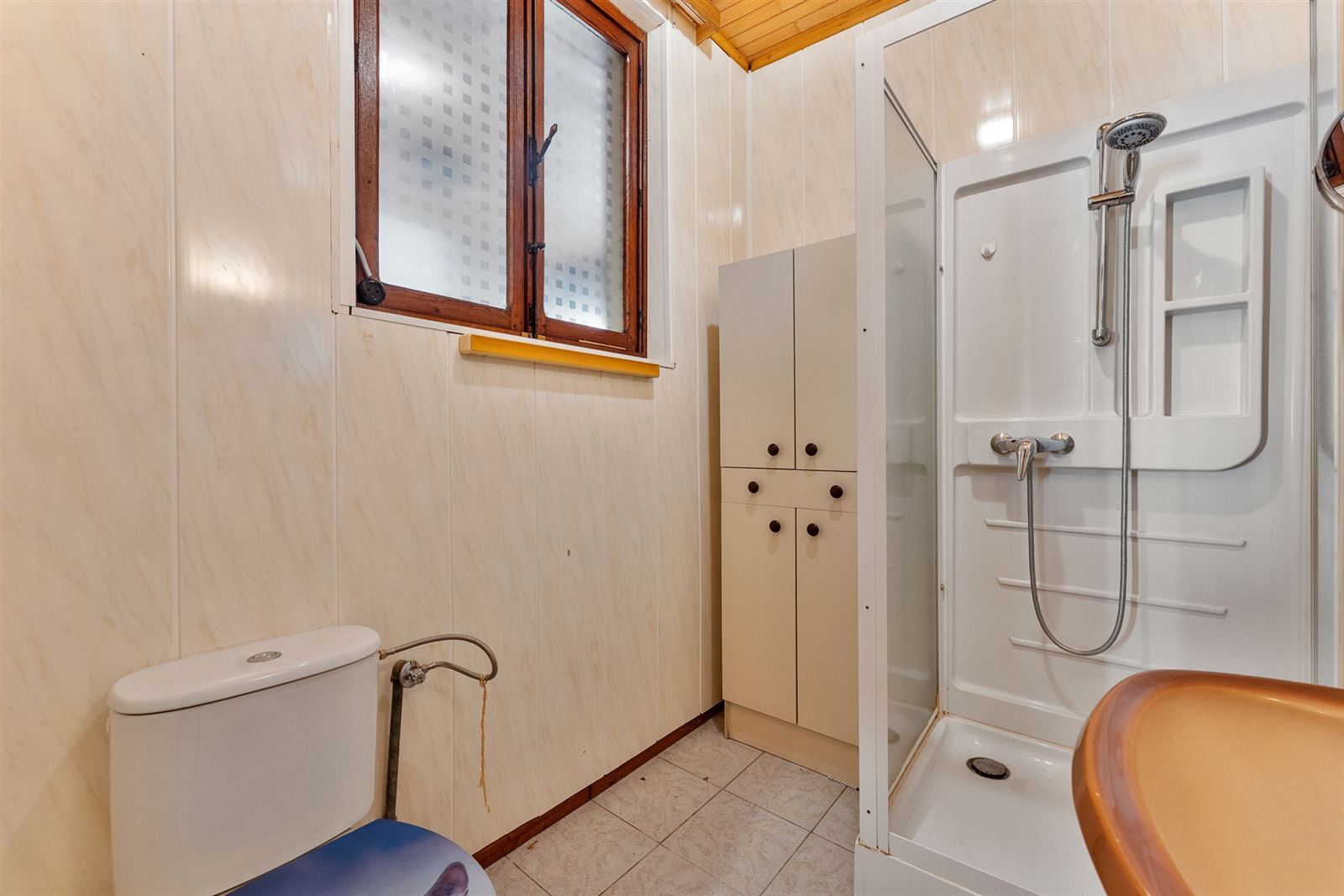 Gelijkvloers: Inkomhal, ruime leefruimte, ingerichte keuken met kasten en toestellen, wasplaats, badkamer (voorzien van lavabo, douche & toilet), berging.