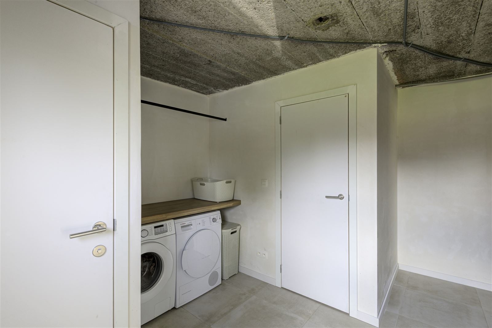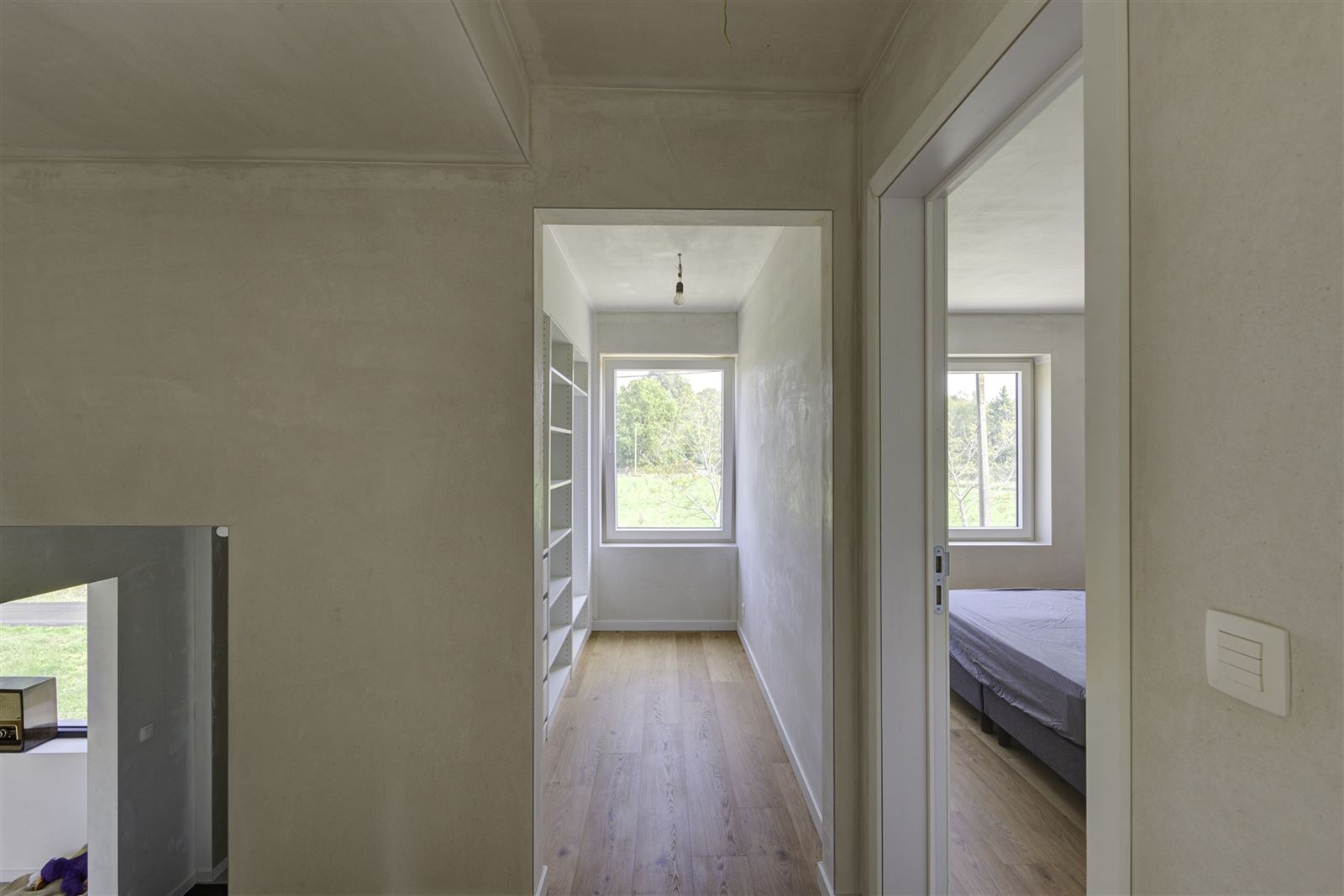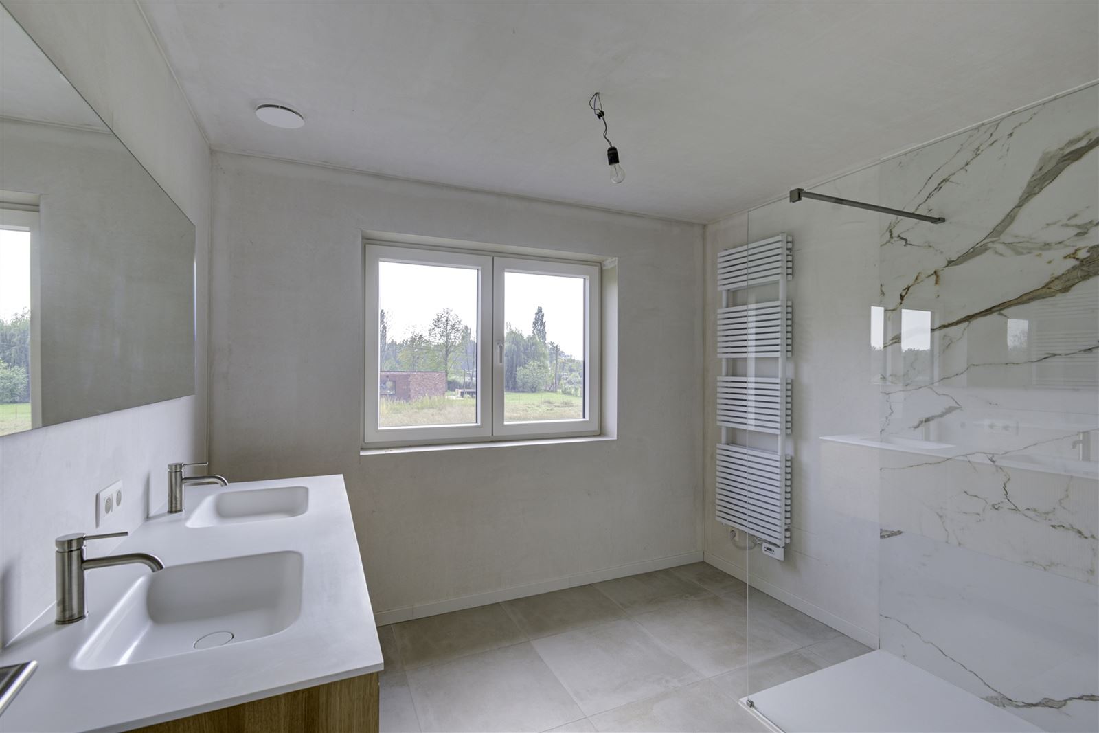 Deze knappe, nog verder af te werken woning, is gelegen in een doodlopende straat, midden in het groen en heeft een prachtig vergezicht. Via de inkomhal die voorzien is van een apart toilet, komen we in de ruime leefruimte met open keuken. Via de keuken kunnen we de trap naar beneden nemen daar bevinden zich de wasplaats, die ook voorzien is van een toilet, en de garage die eventueel nog om te bouwen is naar extra slaapkamer met en-suite badkamer (zie simulatie). Op de eerste verdieping bevinden zich 2 slaapkamers, een badkamer en een dressing. De nachthal geeft ook toegang naar de ruime bergzolder. Verder beschikt de woning nog over een kelder.