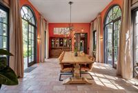 Voorbij de keuken wacht een statige eetkamer, waar hoge boogramen het daglicht royaal binnenlaten.  Hier dineer je met zicht op de tuin en de tijdloze elegantie van het huis.