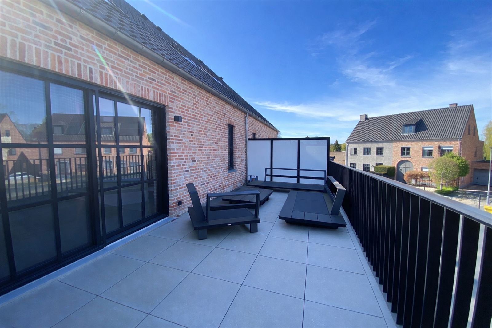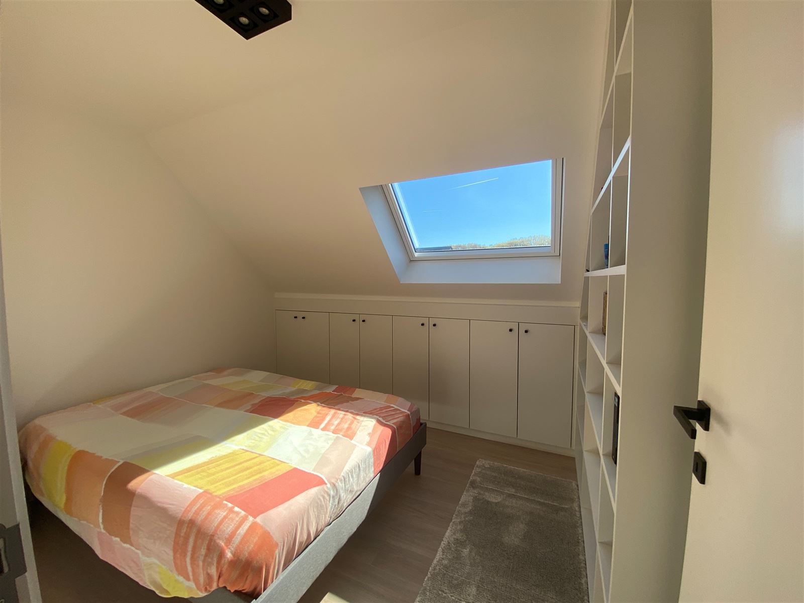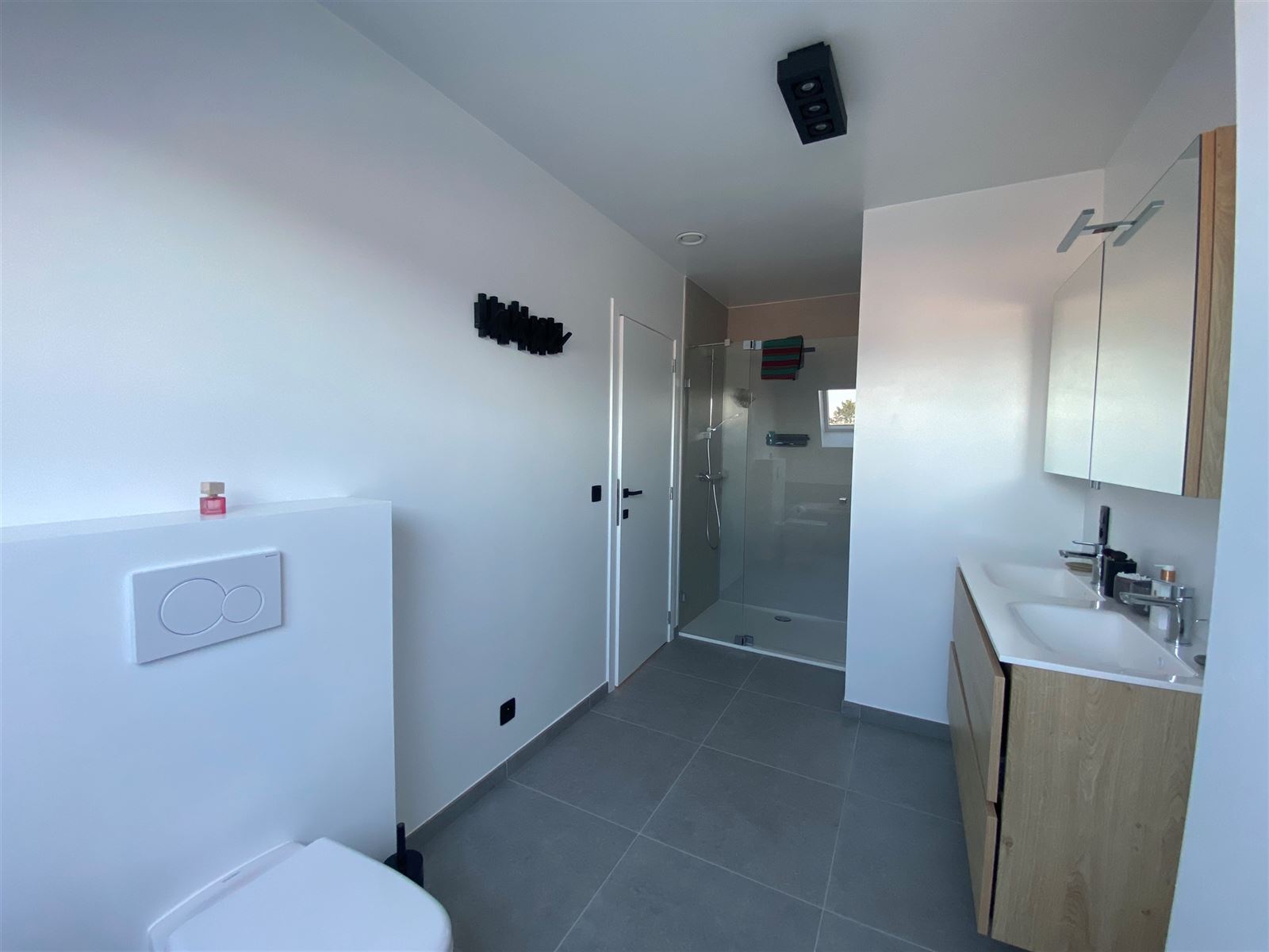 Eerste verdieping: inkomhal met inbouwkast, gastentoilet, ruime lichtrijke leefruimte, volledig uitgeruste moderne keuken, ruime berging, twee terassen (10,50 m² en 7,50 m²) gelegen op het zuiden en het noorden. Tweede verdieping : nachthal, twee slaapkamers respectievelijk 13,75 m² en 10,50 m² waarvan één met inbouwkasten, een dressing, een badkamer met ligbad, douche, toilet en lavabomeubel en een tweede berging/ technische ruimte.