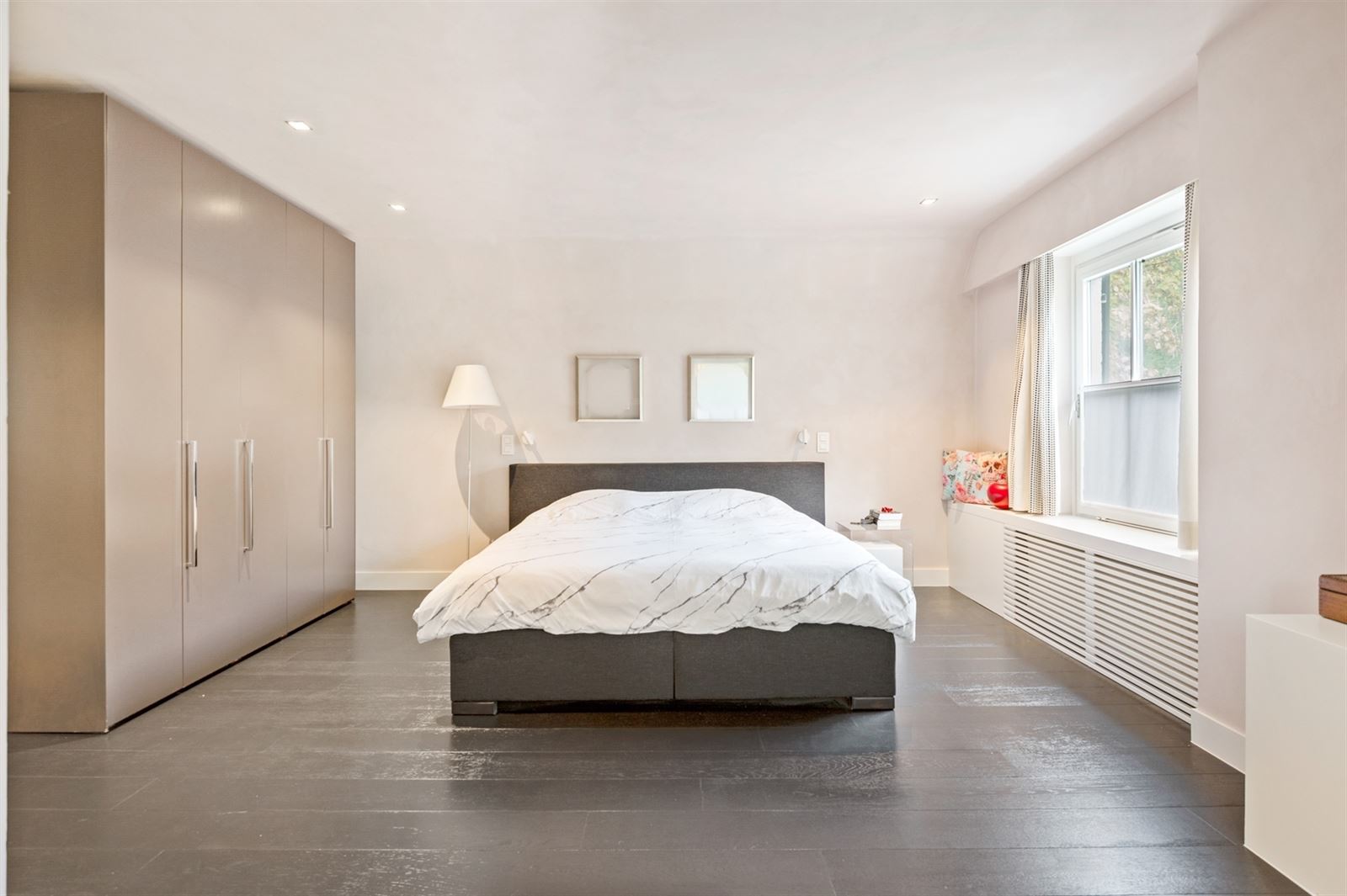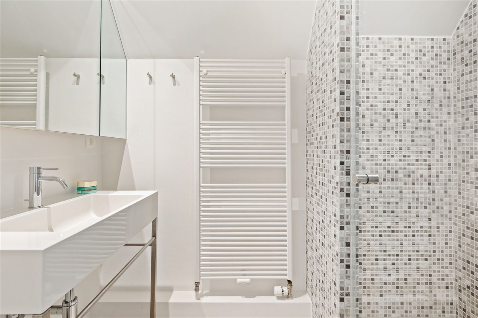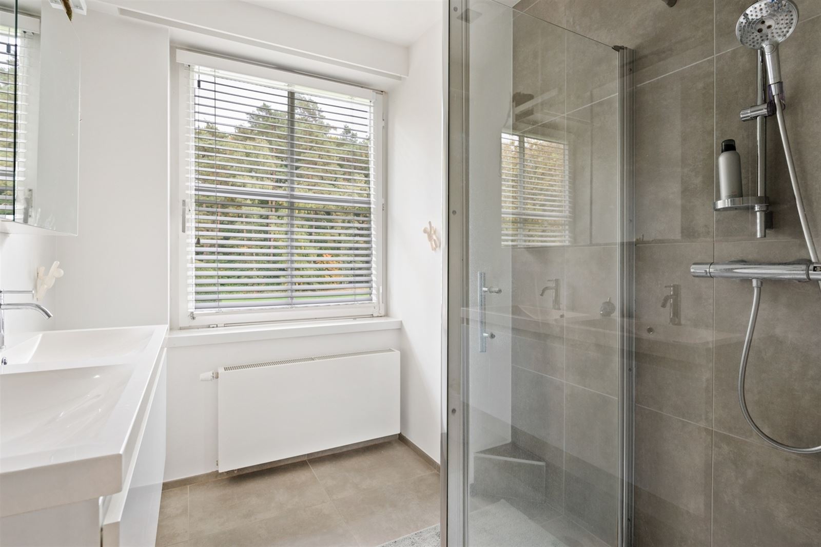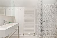 De masterbedroom straalt rust en klasse uit dankzij de stijlvolle kalkverfafwerking. Aansluitend bevindt zich een ensuite badkamer met dubbele lavabo & bad, afgesloten met schuifdeur voor optimale privacy.