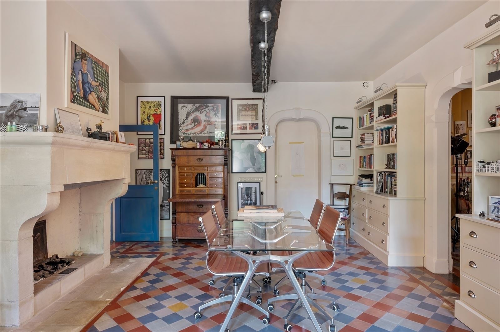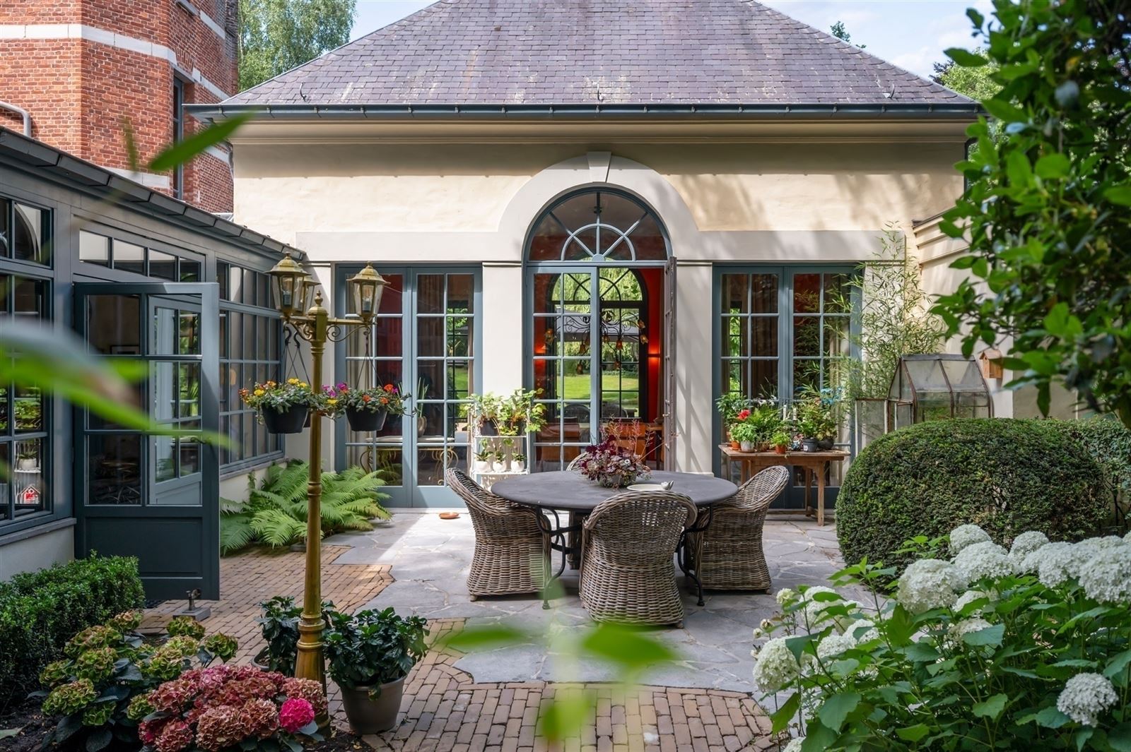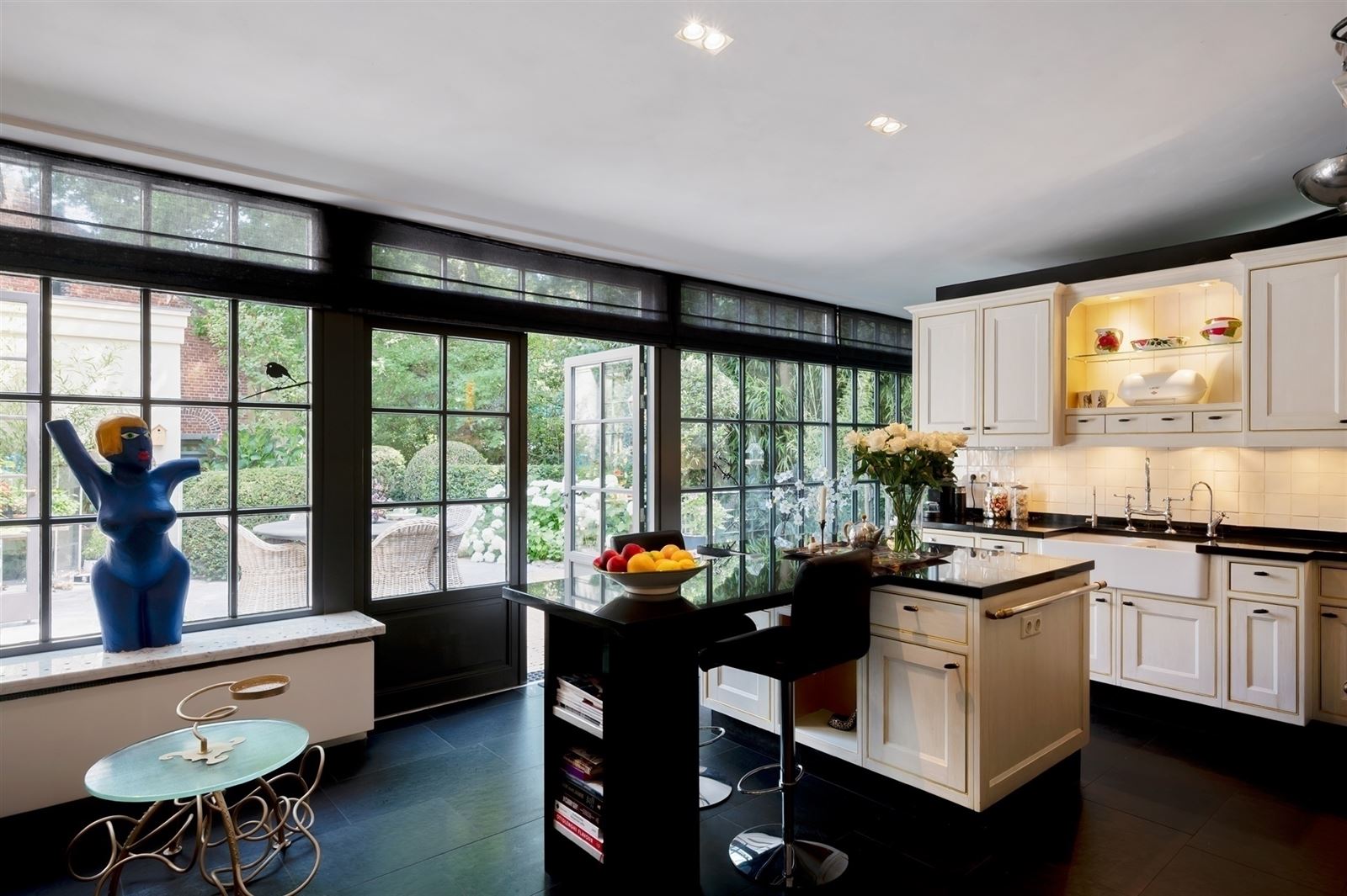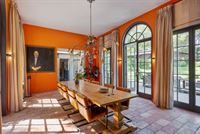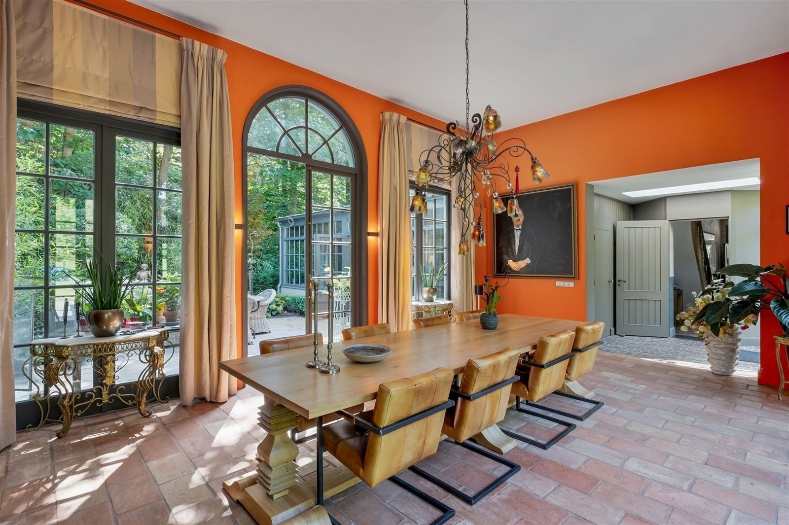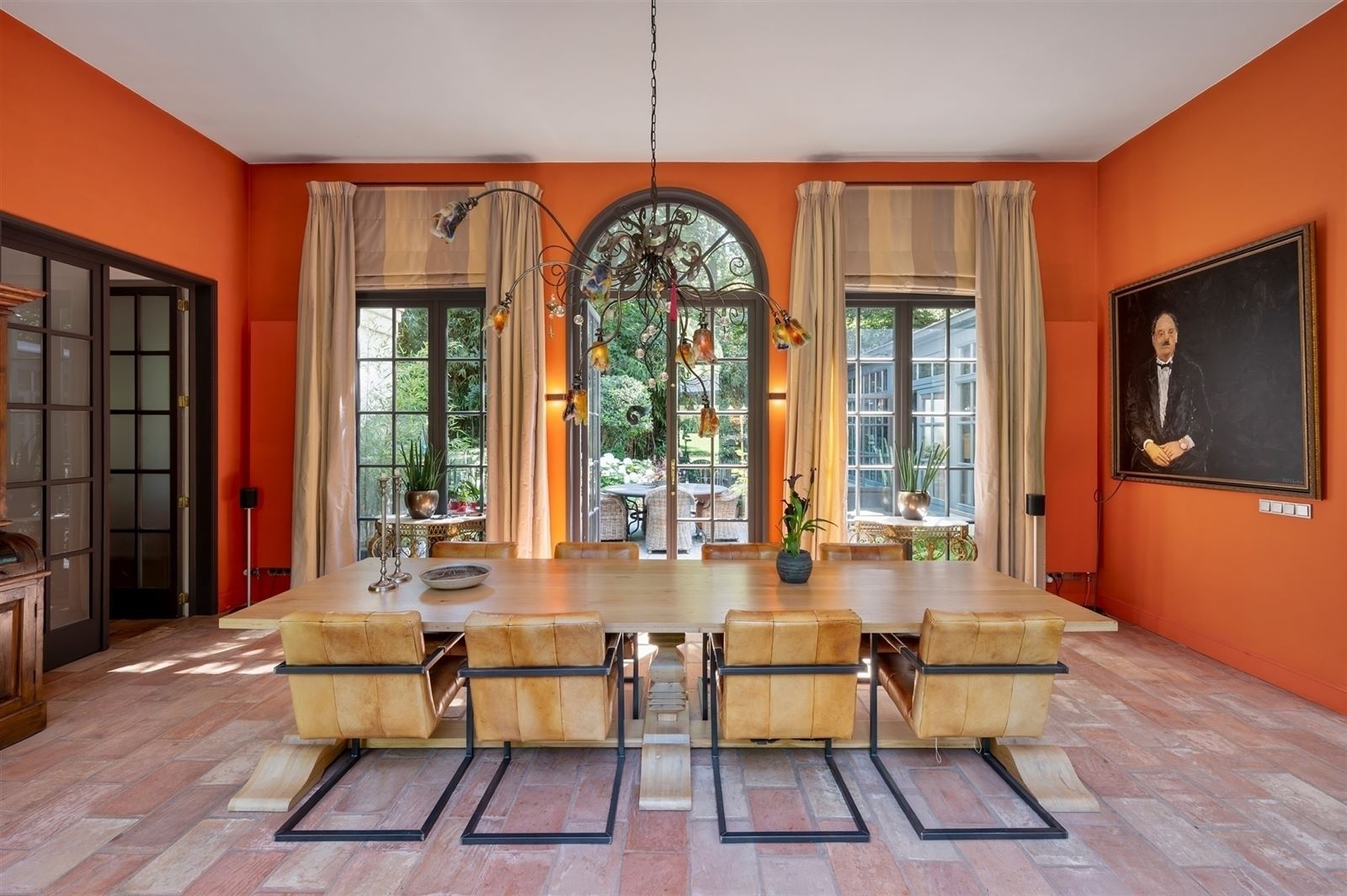 Voorbij de keuken wacht een statige eetkamer, waar hoge boogramen het daglicht royaal binnenlaten.  Hier dineer je met zicht op de tuin en de tijdloze elegantie van het huis.