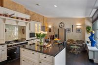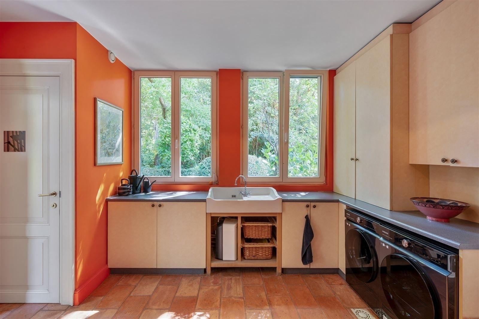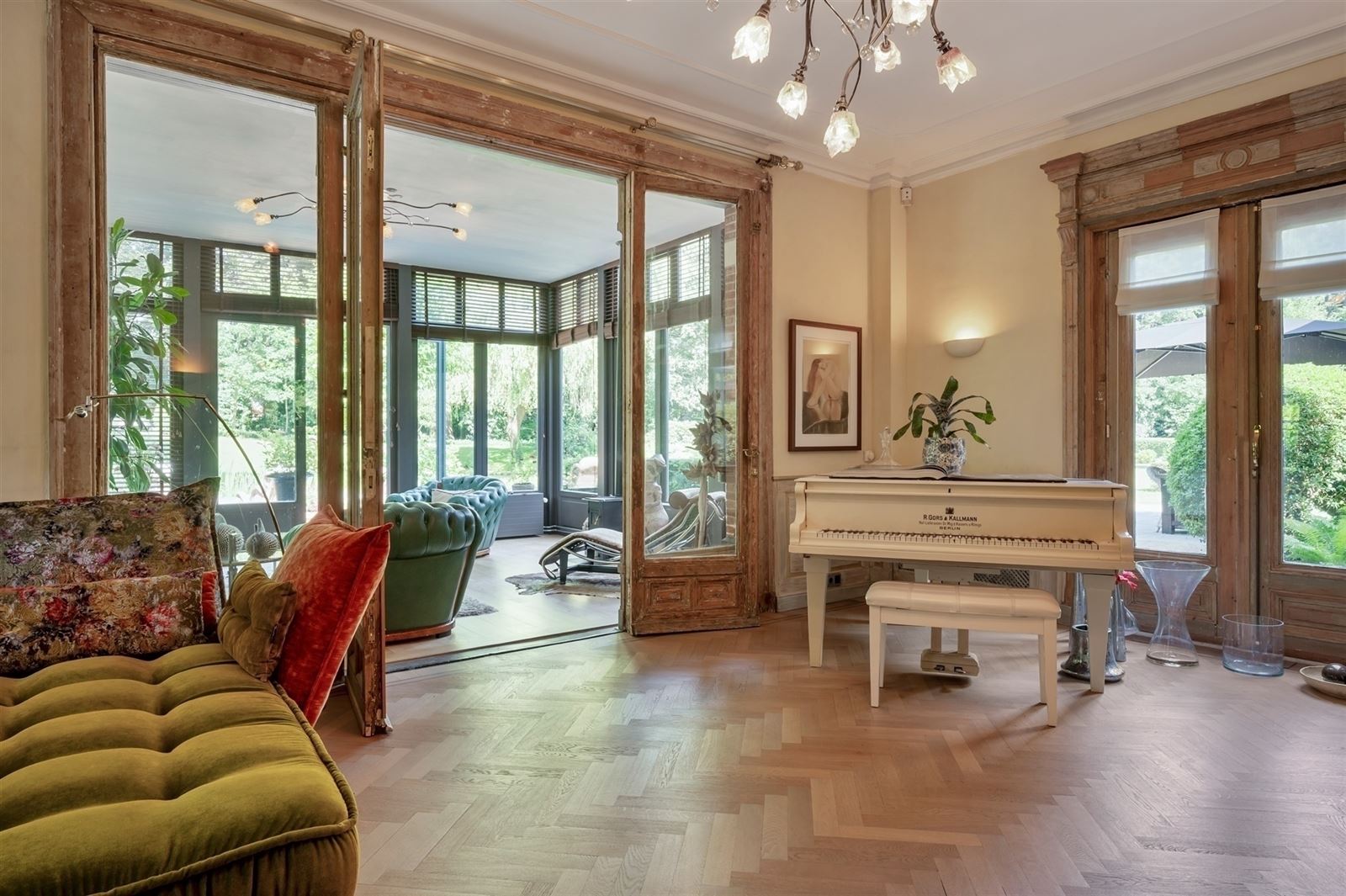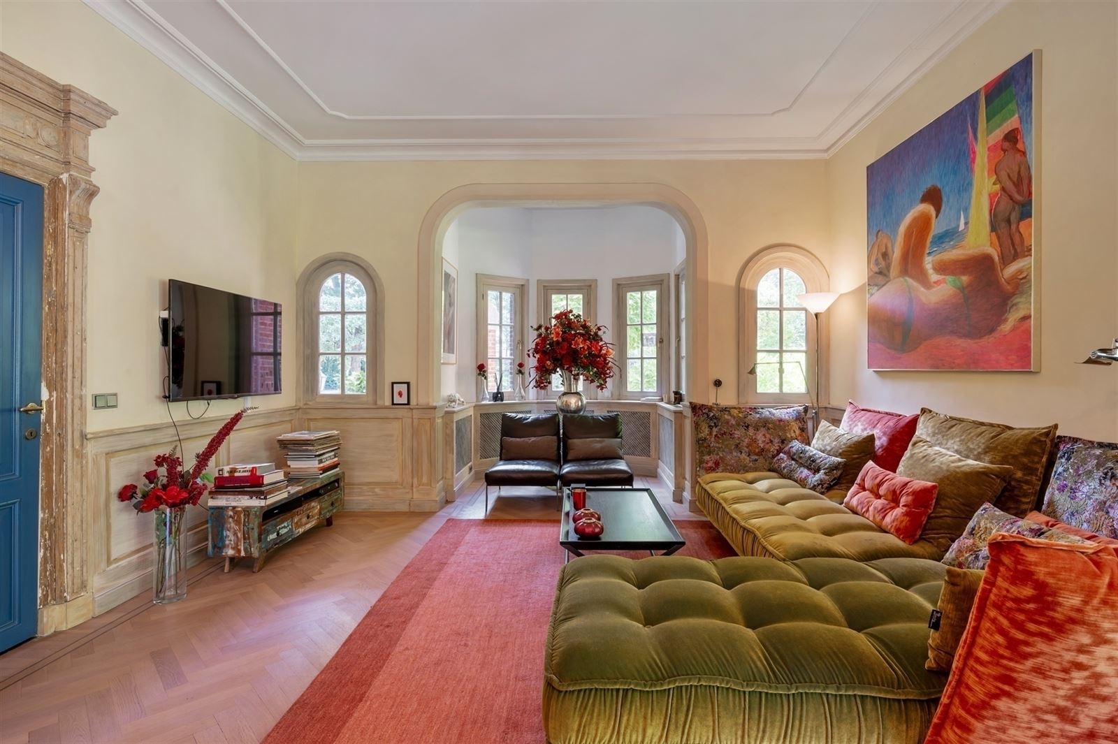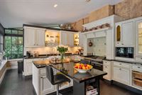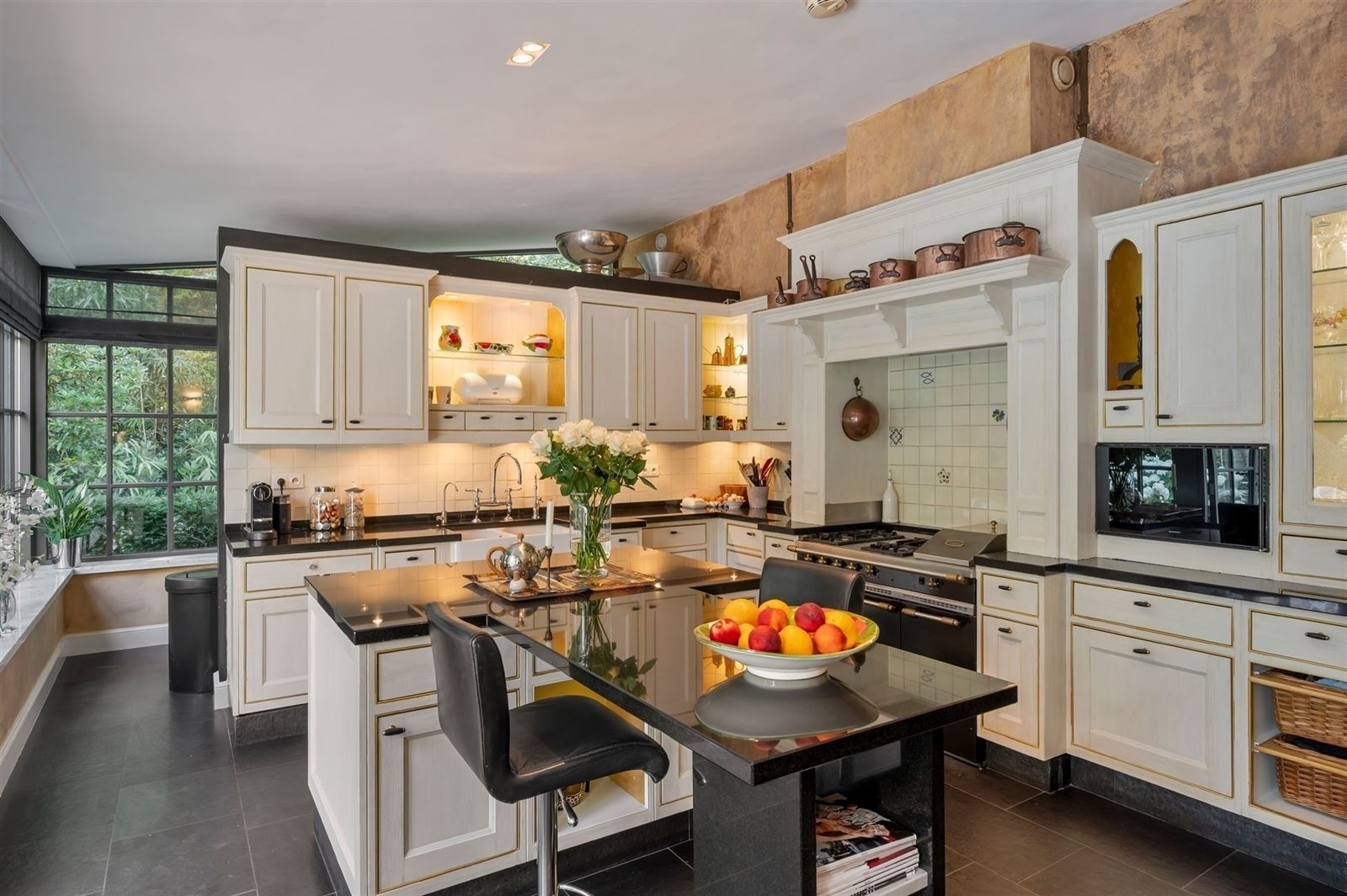 Voorbij de keuken wacht een statige eetkamer, waar hoge boogramen het daglicht royaal binnenlaten.  Hier dineer je met zicht op de tuin en de tijdloze elegantie van het huis.