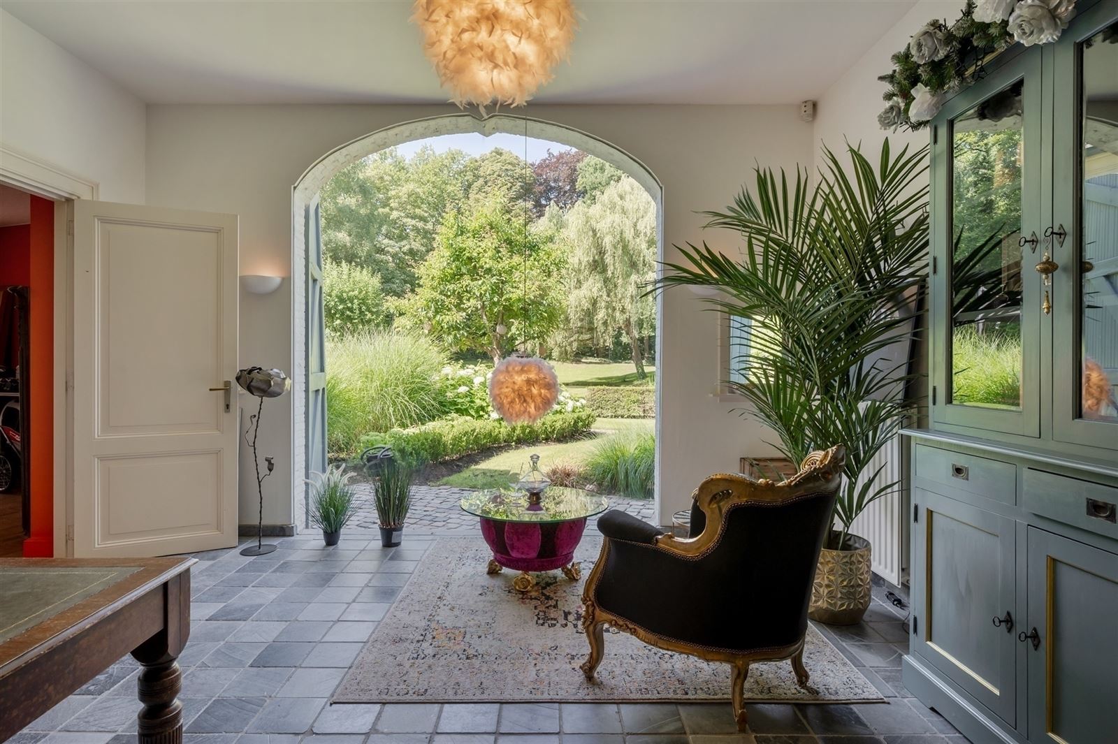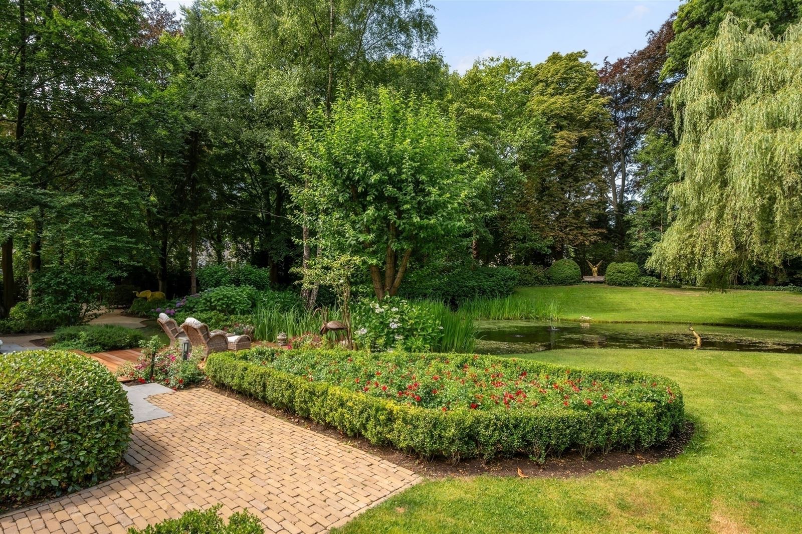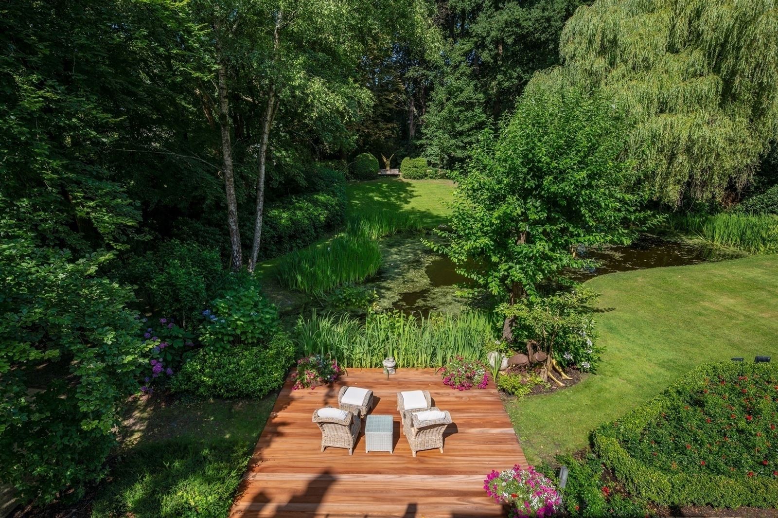 Aan de linkerzijde een prachtige leefruimte verbonden met een veranda die uitkijkt op prachtig aangelegde Wirtz tuin met grasperken, kronkelende wandelpaden & vijver.
