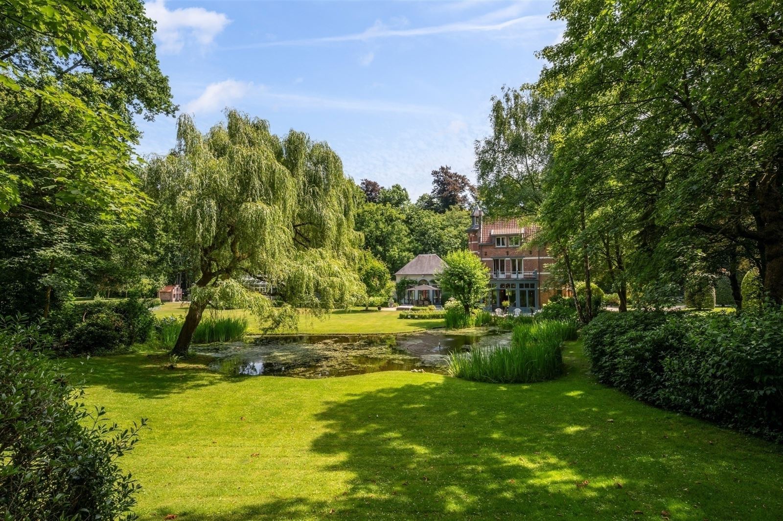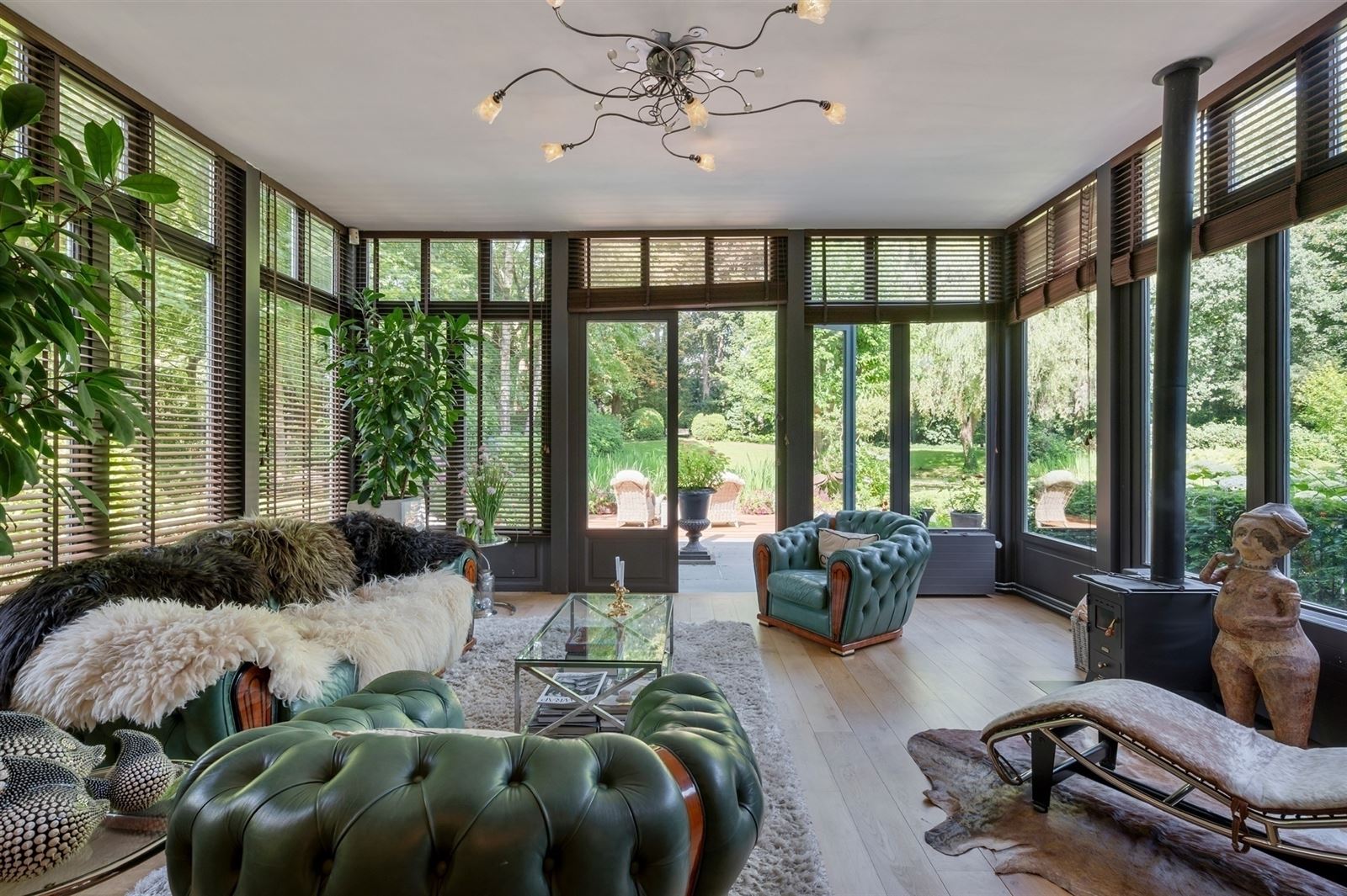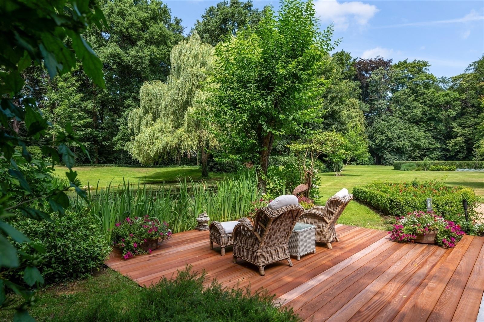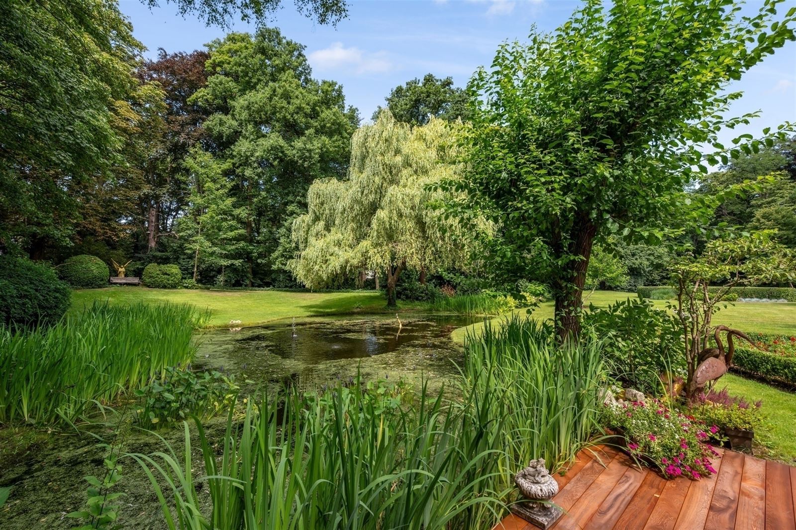 Aan de linkerzijde een prachtige leefruimte verbonden met een veranda die uitkijkt op prachtig aangelegde Wirtz tuin met grasperken, kronkelende wandelpaden & vijver.