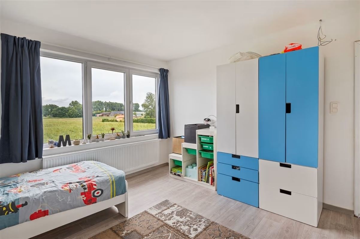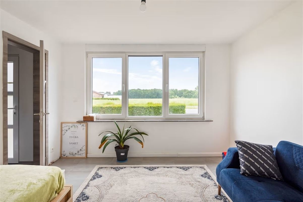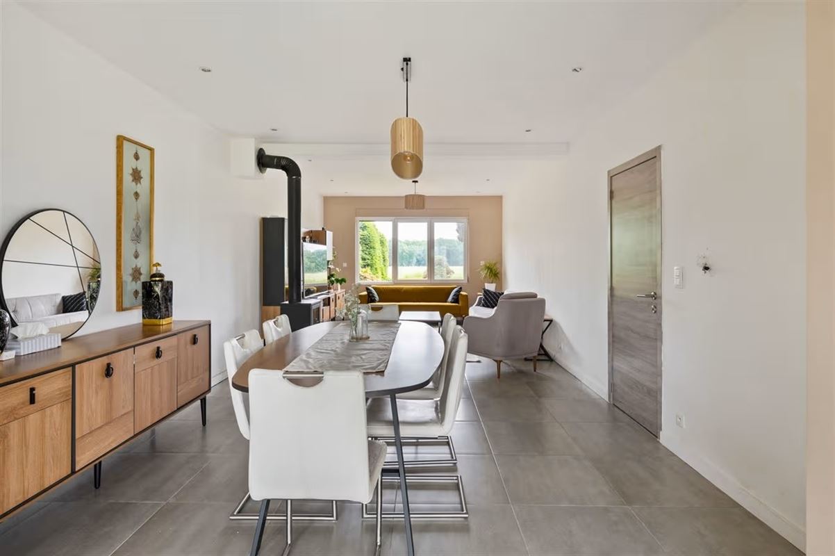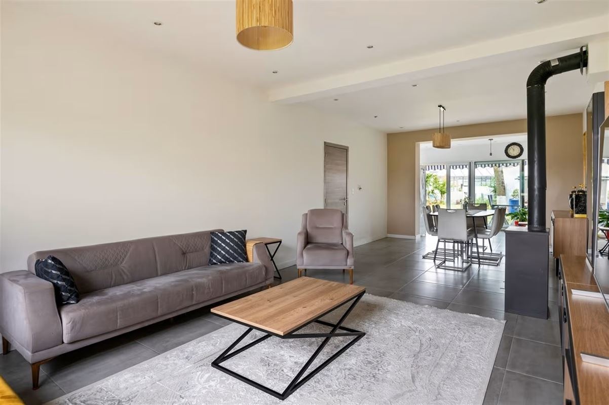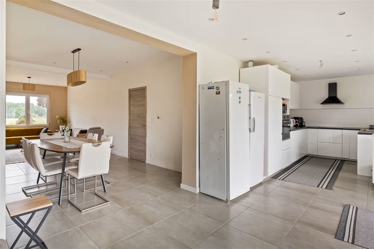 Via de inkomhal kom je in de ruime en lichtrijke woonkamer, waar grote raampartijen zorgen voor een aangename natuurlijke lichtinval. Achteraan bevindt zich de open keuken, die via een groot schuifraam uitgeeft op de zonnige, zuidgerichte tuin.