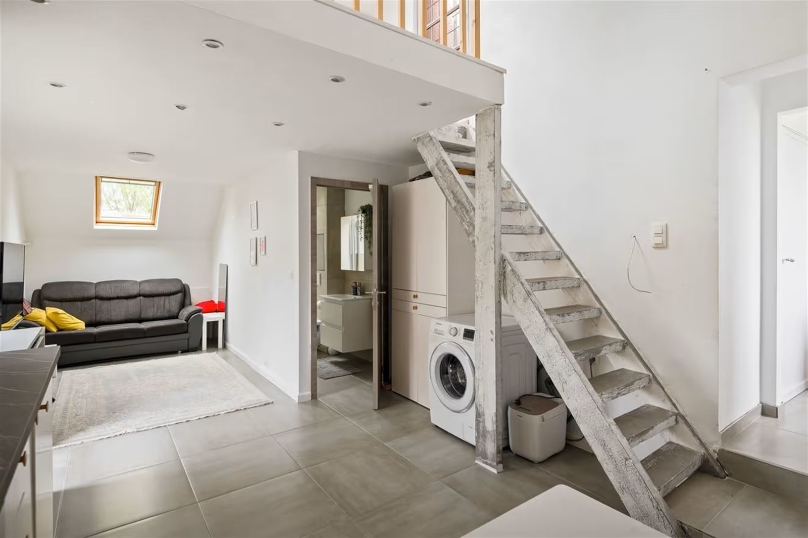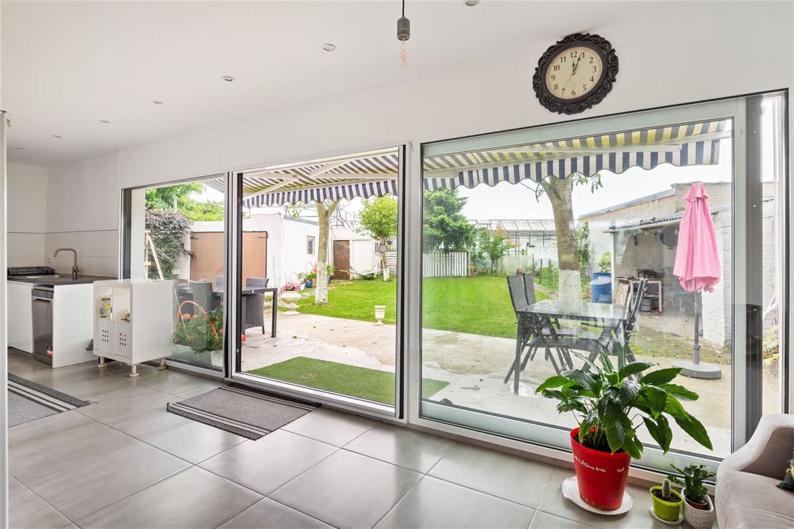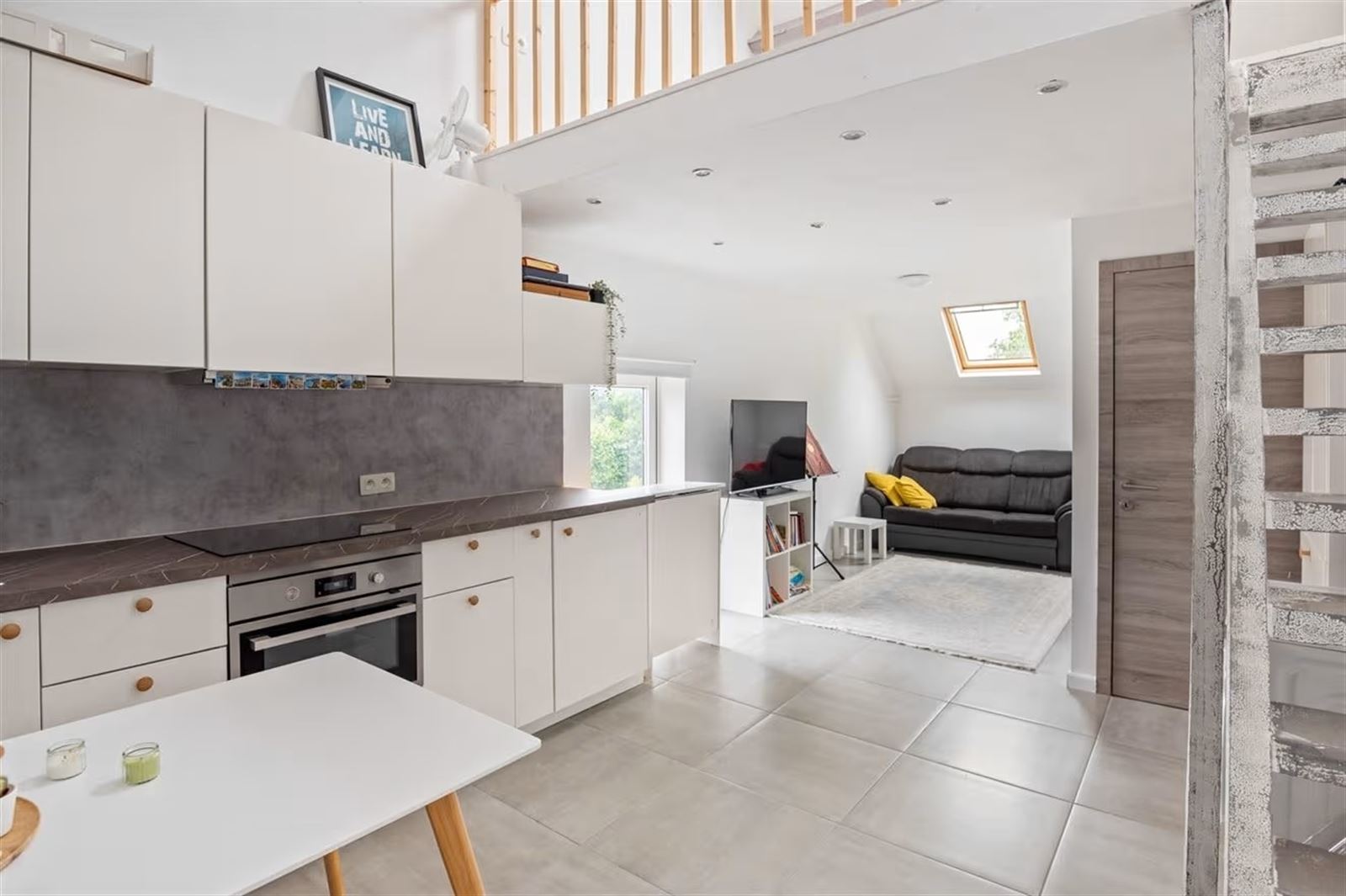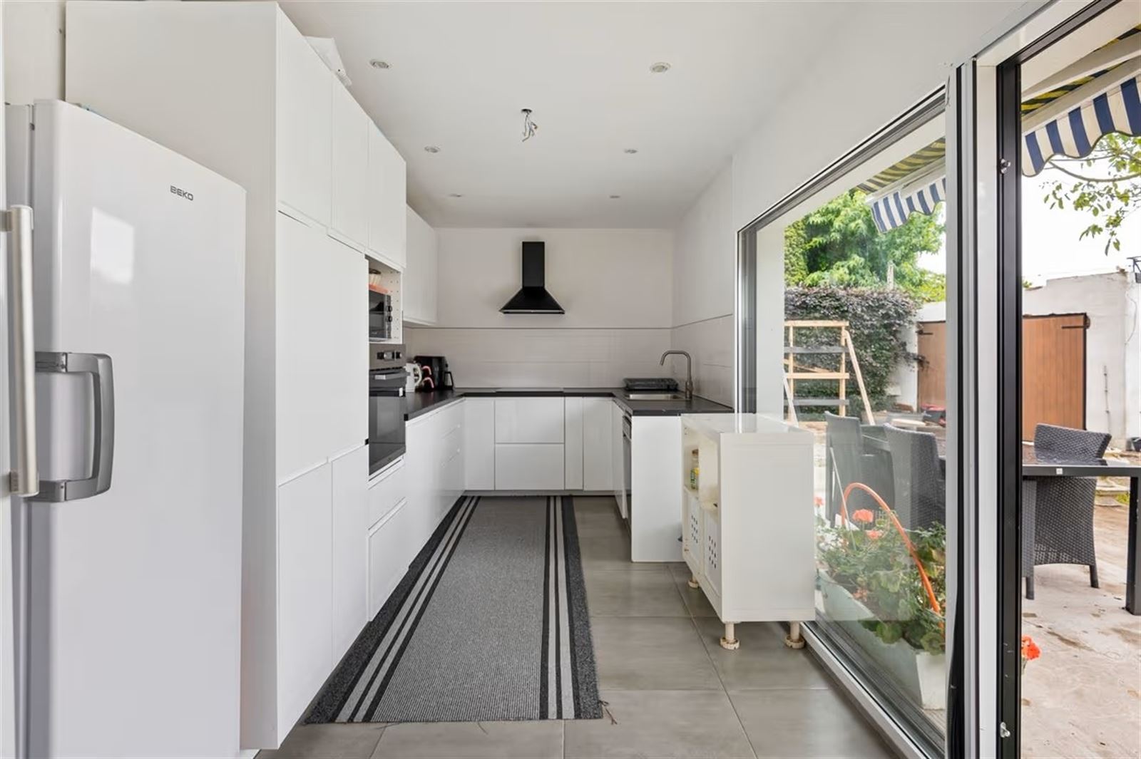 Via de inkomhal kom je in de ruime en lichtrijke woonkamer, waar grote raampartijen zorgen voor een aangename natuurlijke lichtinval. Achteraan bevindt zich de open keuken, die via een groot schuifraam uitgeeft op de zonnige, zuidgerichte tuin.