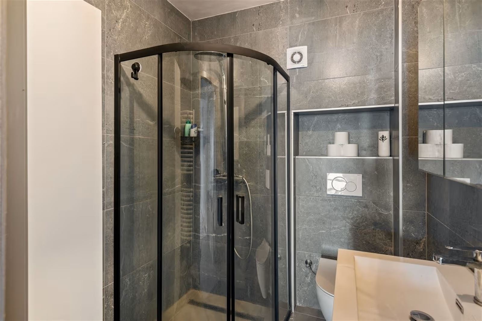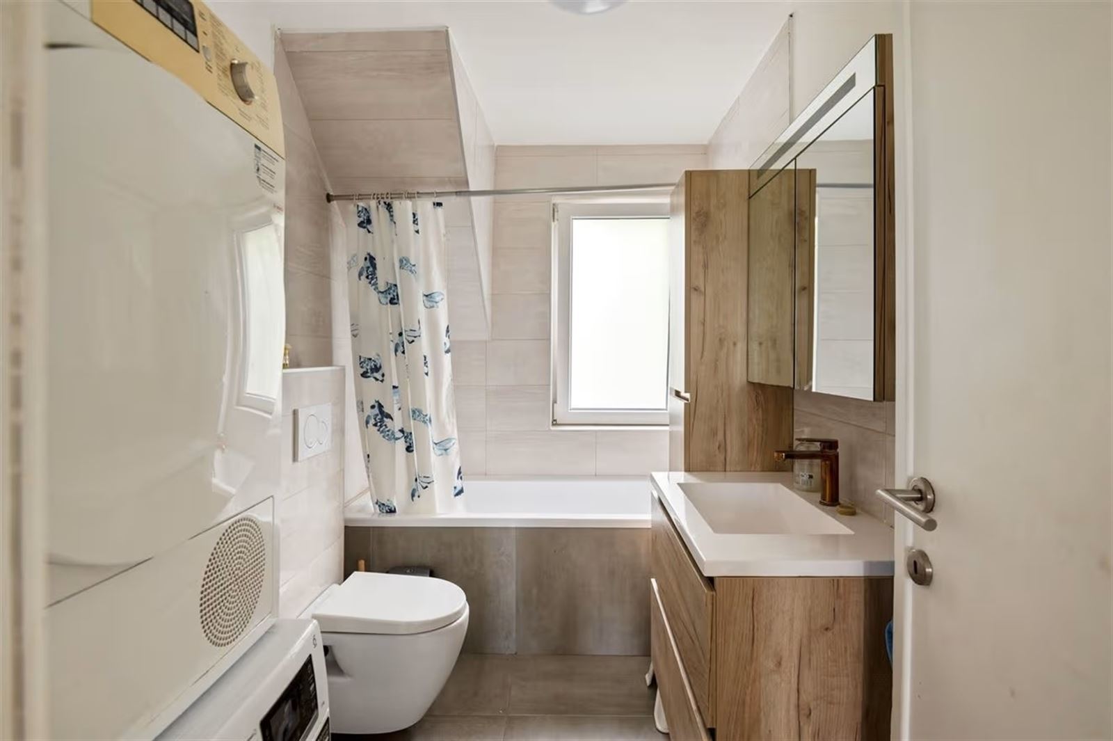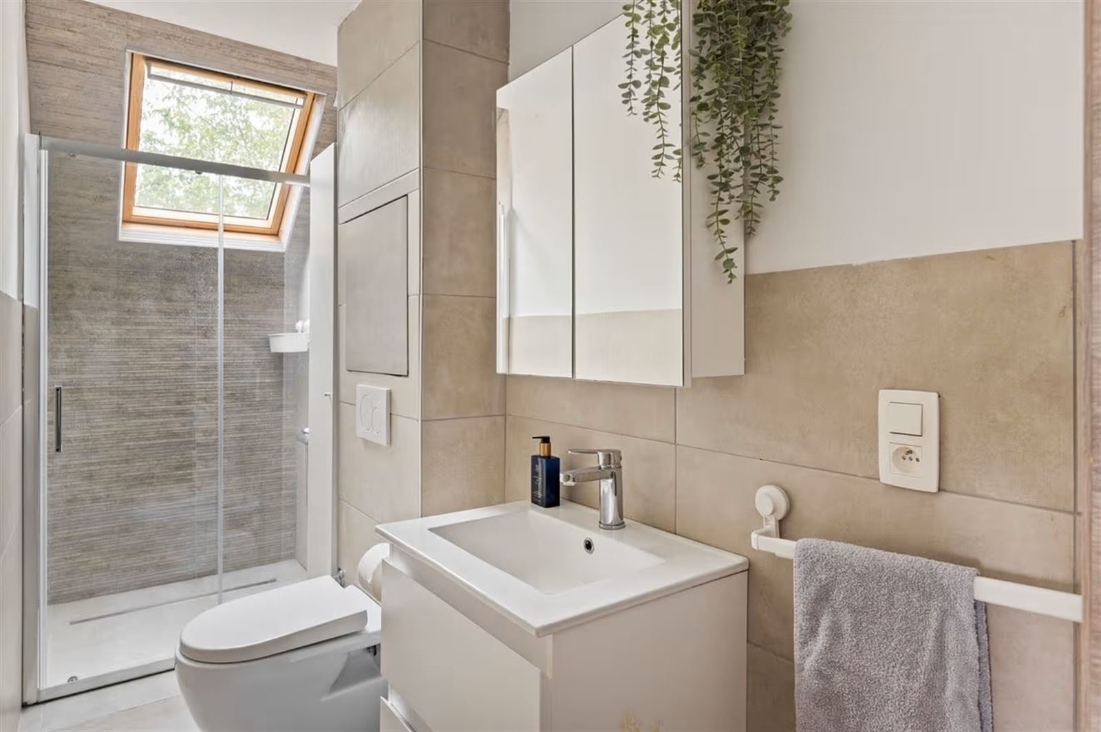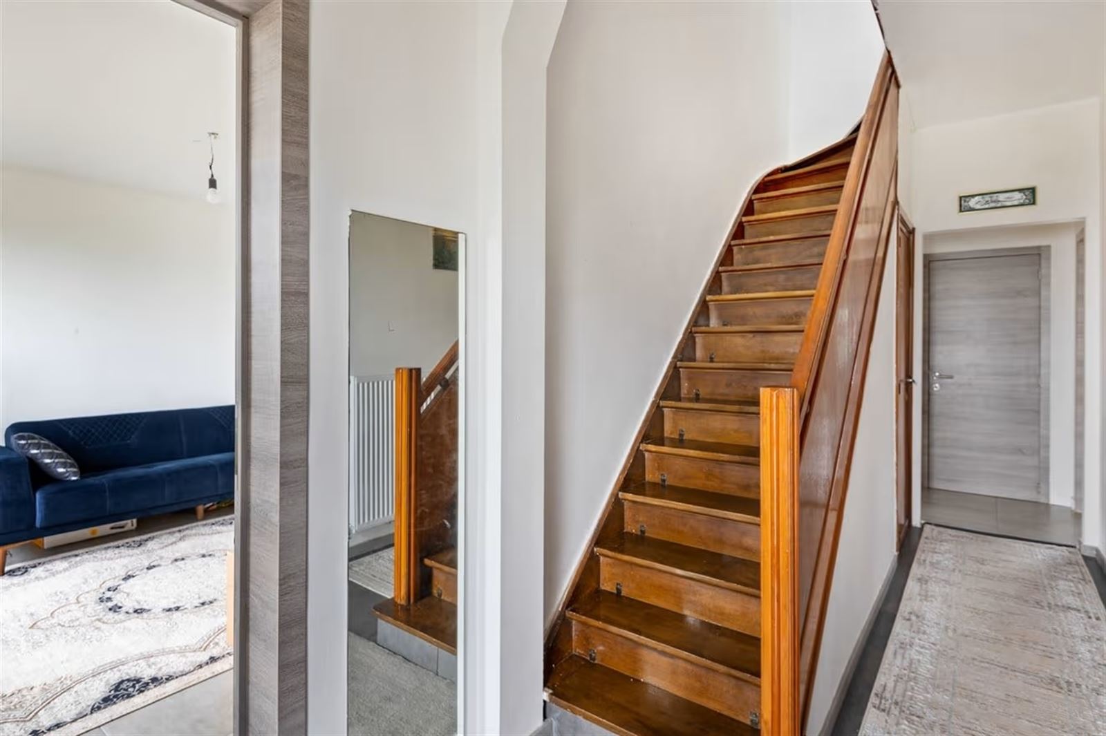 Via de inkomhal kom je in de ruime en lichtrijke woonkamer, waar grote raampartijen zorgen voor een aangename natuurlijke lichtinval. Achteraan bevindt zich de open keuken, die via een groot schuifraam uitgeeft op de zonnige, zuidgerichte tuin.