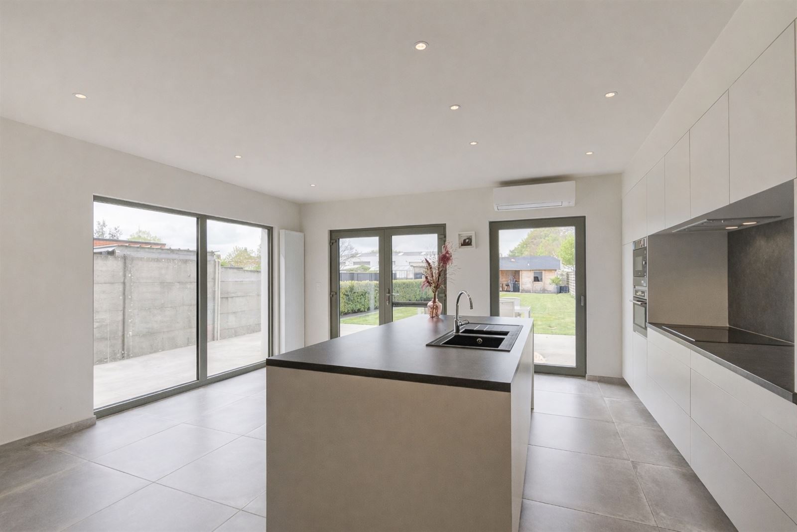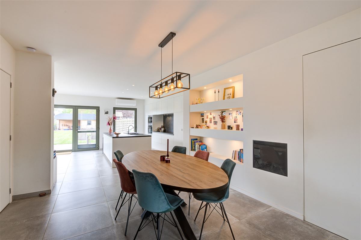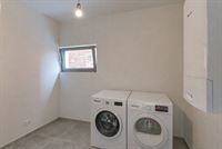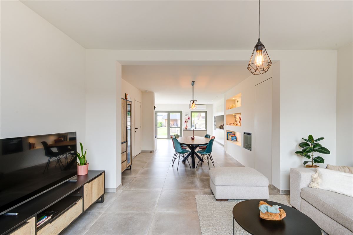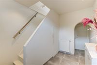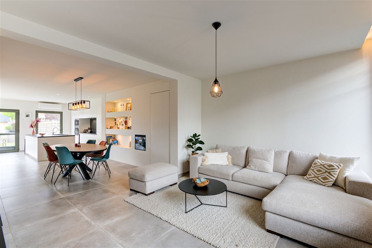 Inkomhal, gastentoilet, gezellige en lichtrijke leefruimte met open keuken en een grote raampartij die uitkijkt op de tuin. Aansluitend vindt u een praktische wasruimte/berging.
