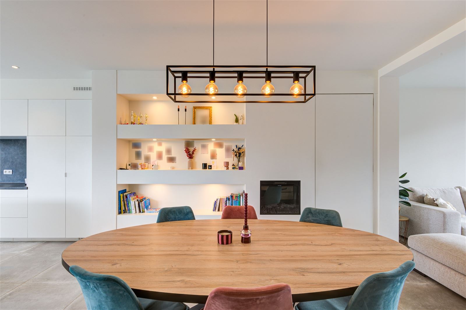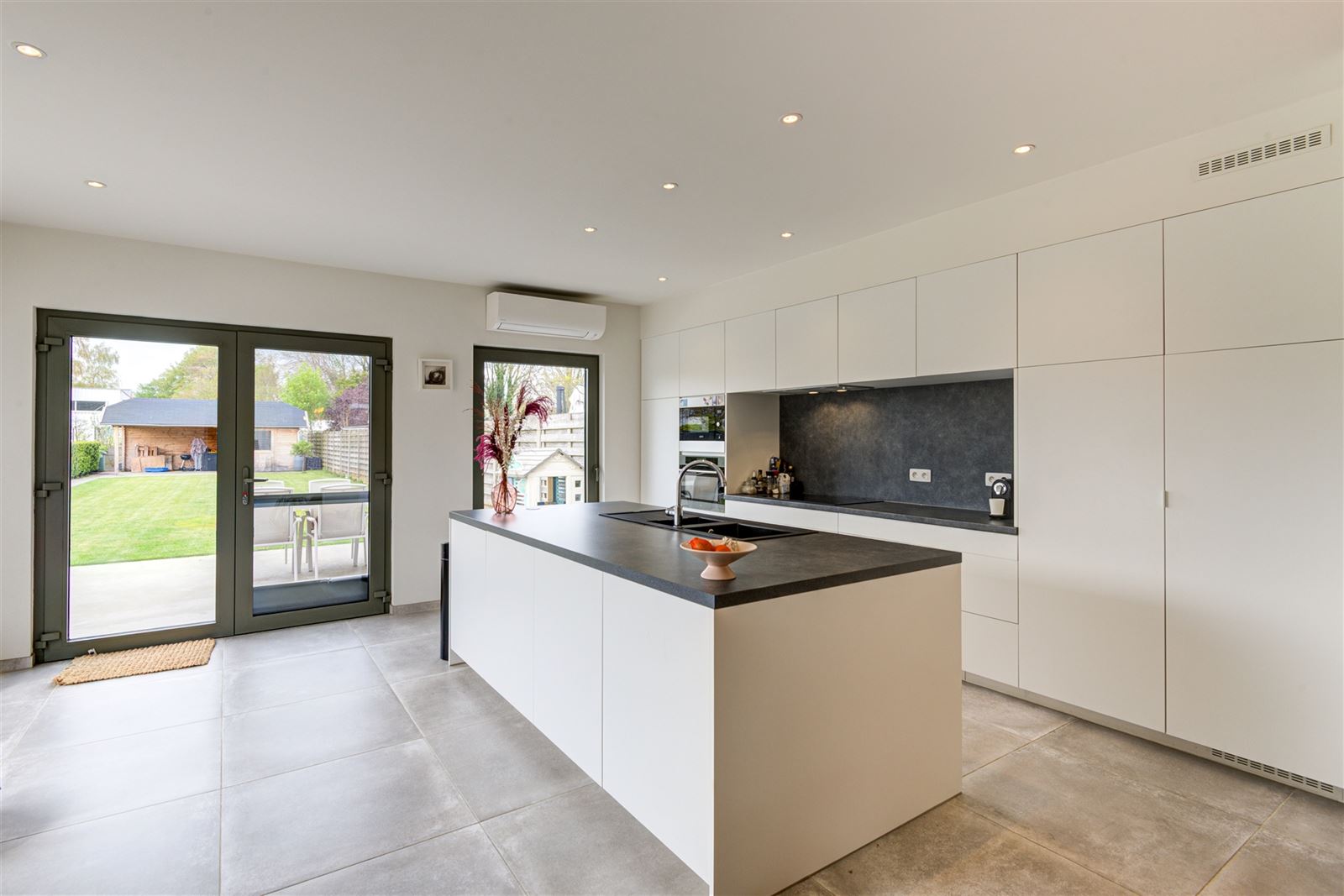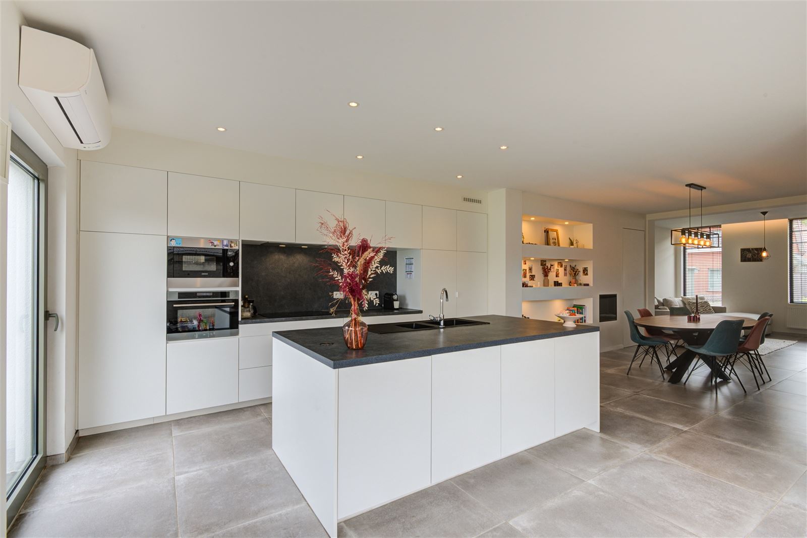 Inkomhal, gastentoilet, gezellige en lichtrijke leefruimte met open keuken en een grote raampartij die uitkijkt op de tuin. Aansluitend vindt u een praktische wasruimte/berging.