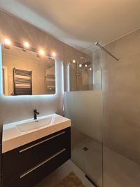 De badkamer is praktisch ingericht met een lavabomeubel, inloopdouche en handdoekradiator. Tevens voorziening om het plaatsen van een wasmachine.